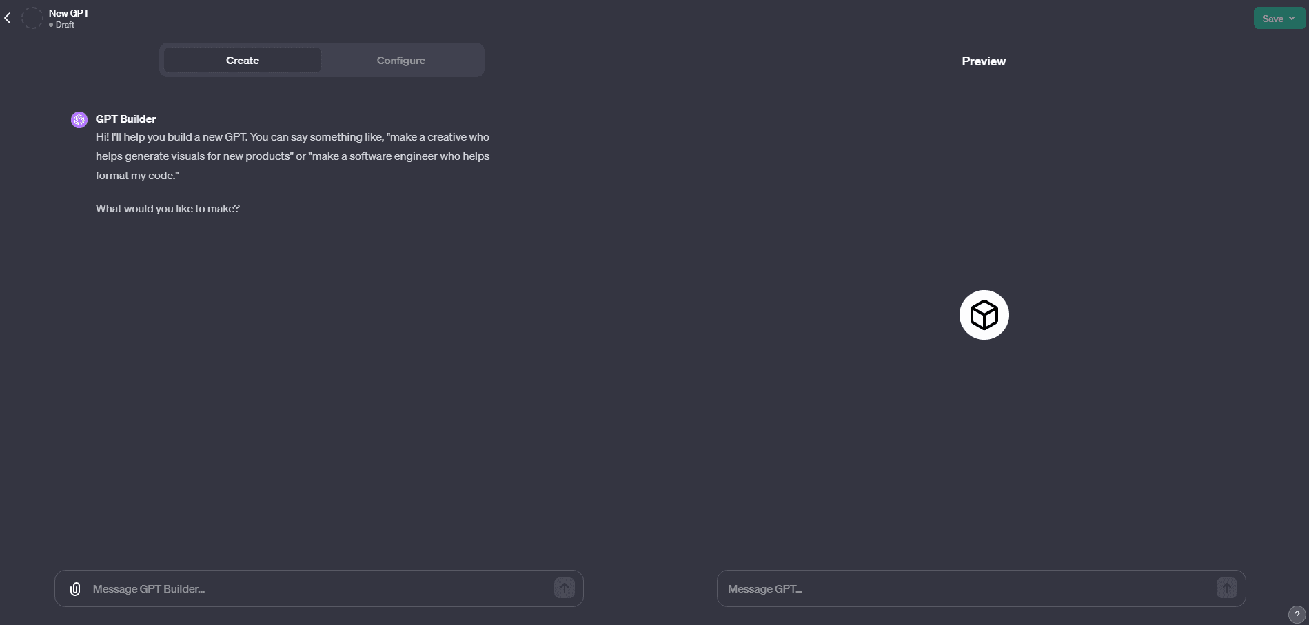 Donc ici tu cliques logiquement sur Create a GPT ce qui va te mener directement à la page de configuration de ton agent.