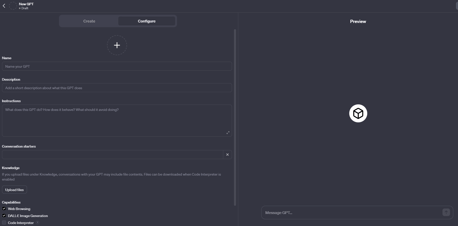Enfin, tu pourras cocher Web Browsing si ton agent a besoin de chercher sur le net, Dall-E pour générer des images et Code Interpreter pour des fonctionnalités avancées. (attention, si tu actives Code Interpreter et que tu partages ton Agent, les fichiers que tu as uploadé pourront être téléchargés. Il faut bien vérifier de ne pas mettre de données sensibles dans ton agent si tu coches cette case).
